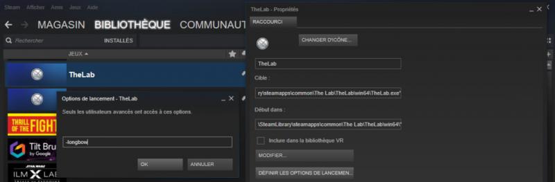 Pour ajouter Robot Repair, ajouter /SteamApps/common/The Lab/RobotRepair/bin/win64/vr.exe comme jeu "non Steam" et ajouter les options de lancement suivantes : -noassert -retail -autofidelity +map vr_aperture_main +vr_multitool_wormhole 1 +closecaption 0 +cc_subtitles 0 5ème étape : profiter du menu Propriétés pour ajouter le raccourci aux jeux compatibles VR, renommer l'application et modifier l'icône par une icone PNG 256px. 6ème étape : avec le clic droit sur l'expérience, ajouter un raccourci sur le bureau Windows et remplacer l'icône dans ses propriétés par l'une de celles du répertoire ICO téléchargé en étape 2.